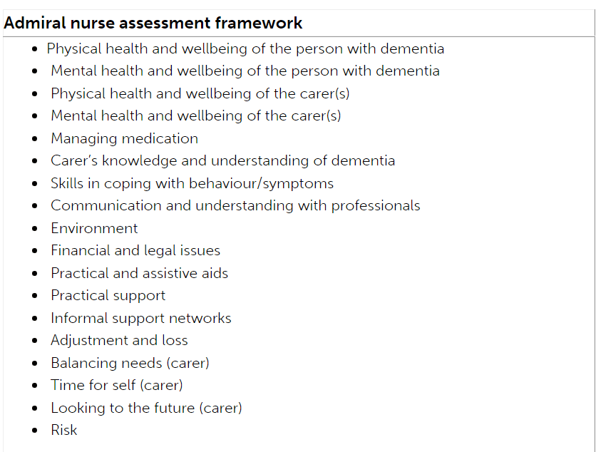 - They are all trained to work through the Admiral Nurse Assessment framework for each family, looking at areas as listed below. So you can see how much they cover and have experience of to be able to help and support you throughout your dementia journey.