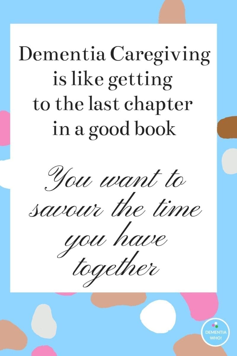 Knowing that you are making a significant difference in someone’s life can give your own life a deep sense of purpose. Caregiving is more than a duty; it’s an opportunity to find meaning in the everyday and to grow emotionally and spiritually. Caregiving has really brought home to me what’s really important in life, it’s changed my priorities and helped me grow both emotionally and spiritually. The emotional ups and downs of caregiving force to you look hard at your own life. I know my life is forever changed caring for mum, and I have new sense of purpose making sure mum gets the best care possible and that I use the knowledge I’ve gained to help others. It’s allowed me to explore new career paths in dementia, allowed me to write this blog, and helped me educate myself and others in the reality of dementia care.