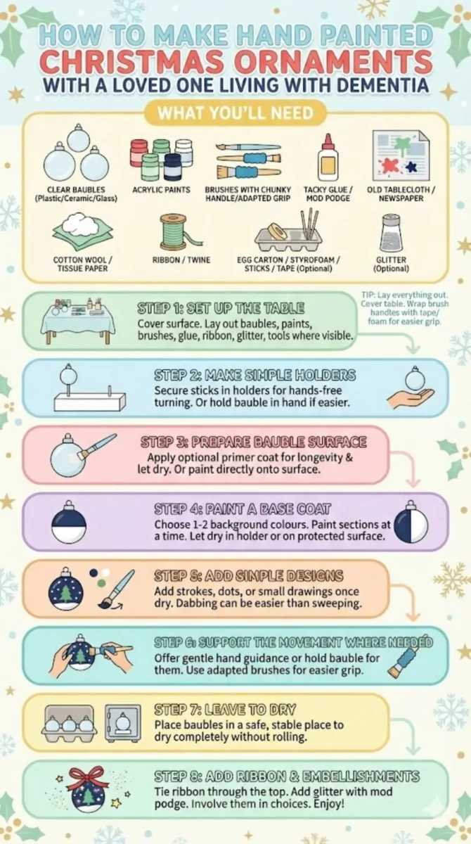 Making your own hand painted Christmas ornaments adds a personal touch to your decorations. It can be a relaxing activity to do with family, with children, or as a simple craft to share with someone living with dementia.