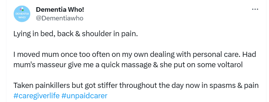 Being a dementia caregiver is a challenging role, and one that often comes with not just an emotional toll but a physical one as well. I shared this post on twitter late at night as I lay in pain in bed after injuring my back.